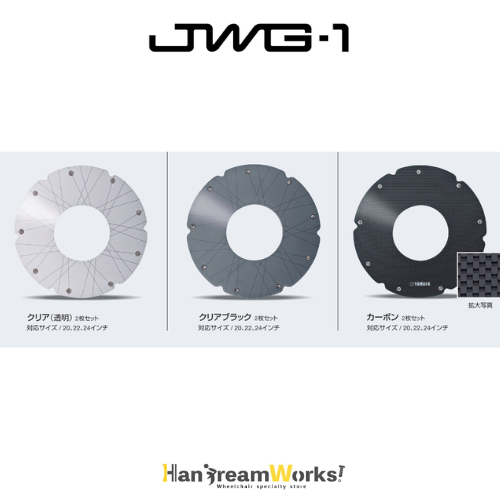 ヤマハ製電動車椅子(JWG-1)の魅力をさらに引き立てるスポークカバーが登場!クリア(透明)・クリアブラック・カーボンの3種類のカラーで、あなただけの電動車椅子を演出しましょう。20・22・24インチのサイズに対応しており、幅広いニーズに応えます。